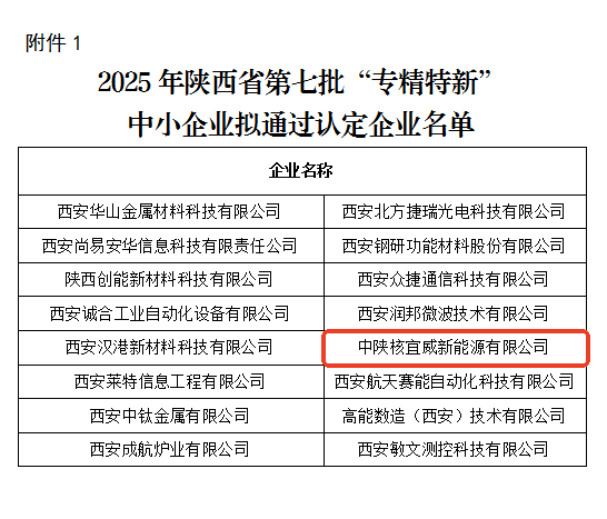 近日,陕西省工信厅发布了《2025年陕西省“专精特新”中小企业拟认定和拟复核通过企业名单的公示》,宜威公司凭借其在专业化、精细化、特色化、创新型方面的突出表现,成功入选省级“专精特新”企业名单。这一称号的取得不仅是对公司聚焦主业、创新发展的成果印证,更是对中陕核集团“创建核特色鲜明的国内一流专精特新企业集团”战略规划的深度践行。
